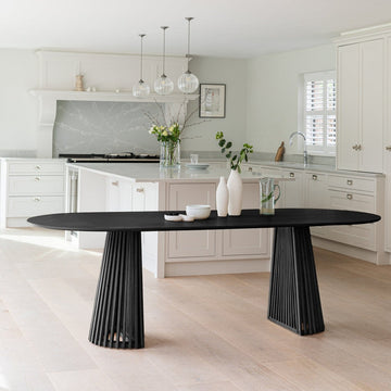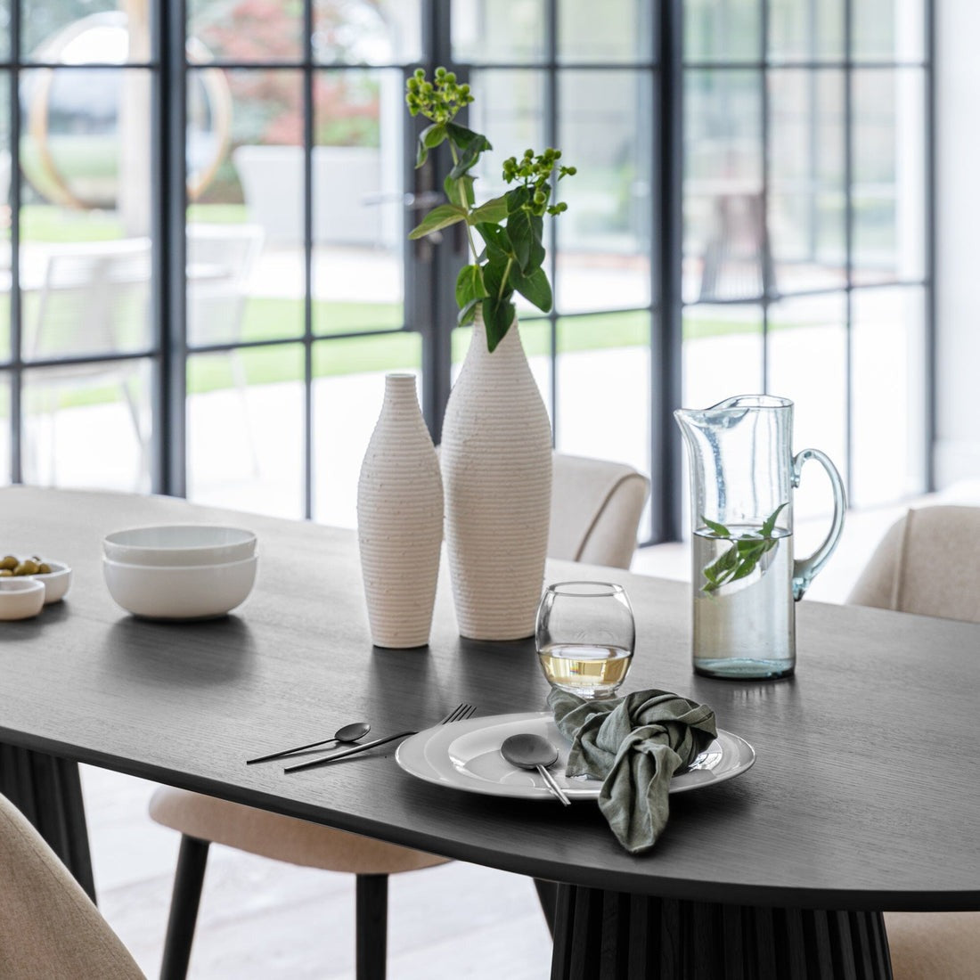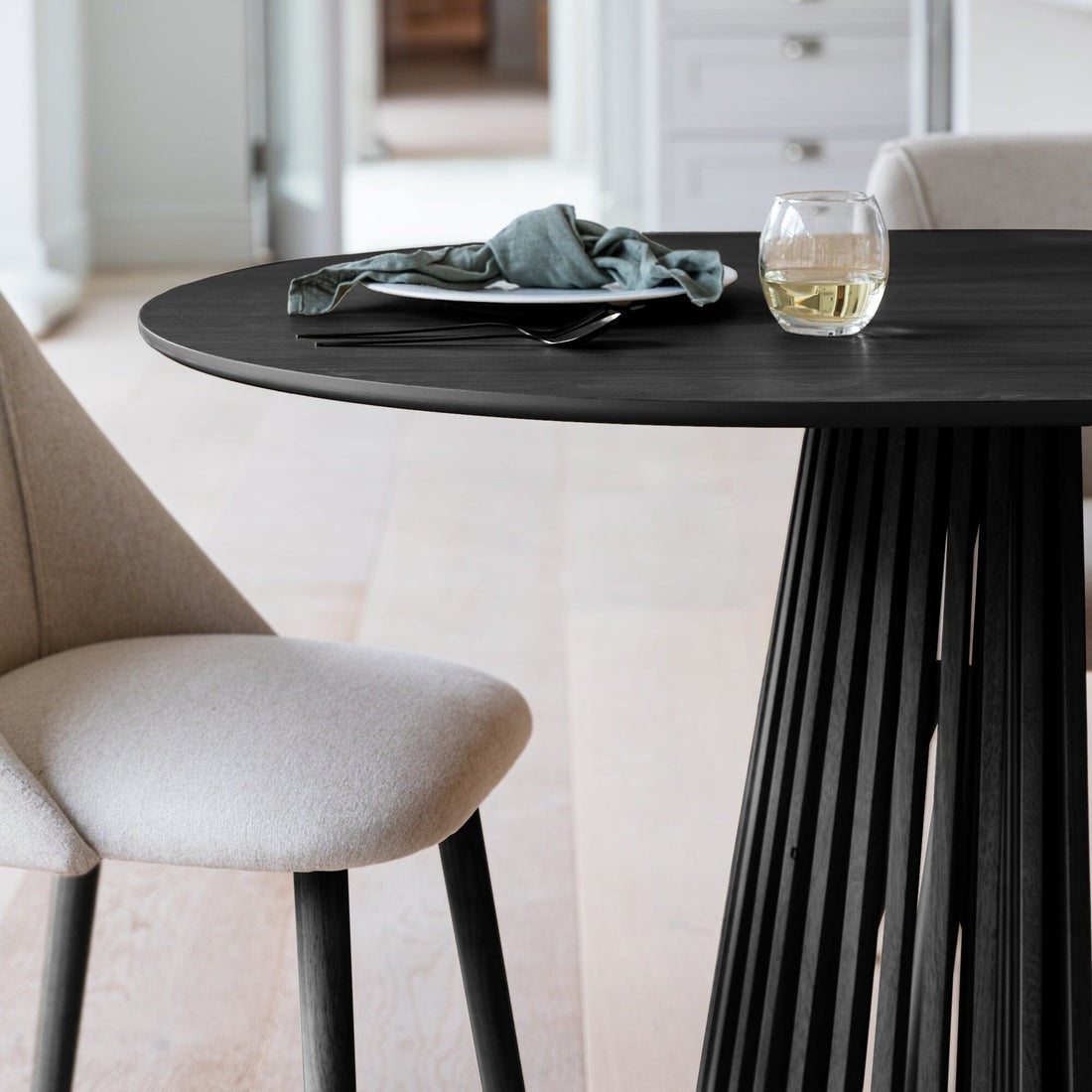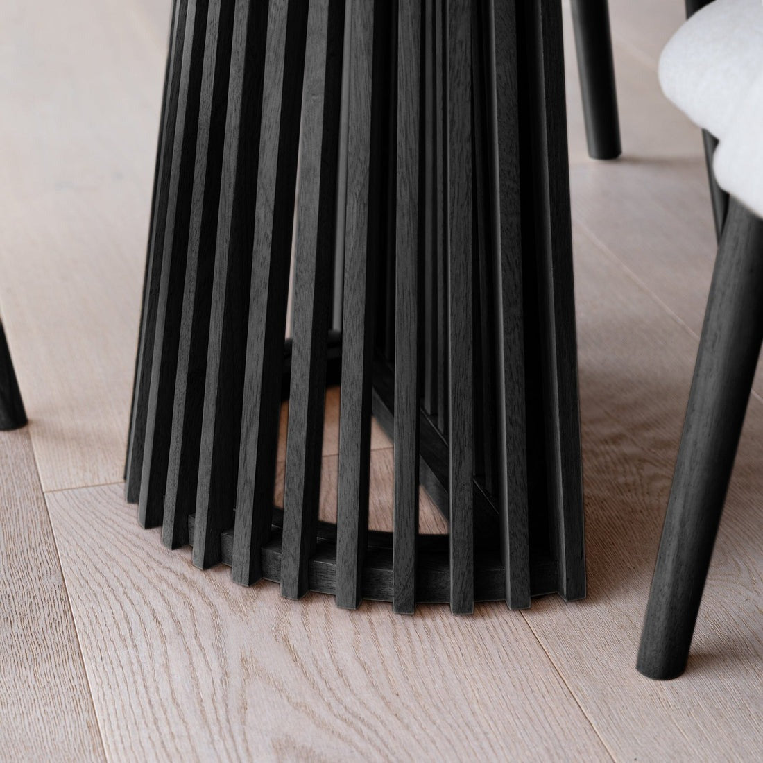 The Avira Dining Table blends elegance with contemporary design, highlighted by its slatted base and smooth curves. The Elira Chairs bring softness and comfort, creating a beautifully balanced set that showcases the best of Indian craftsmanship.