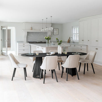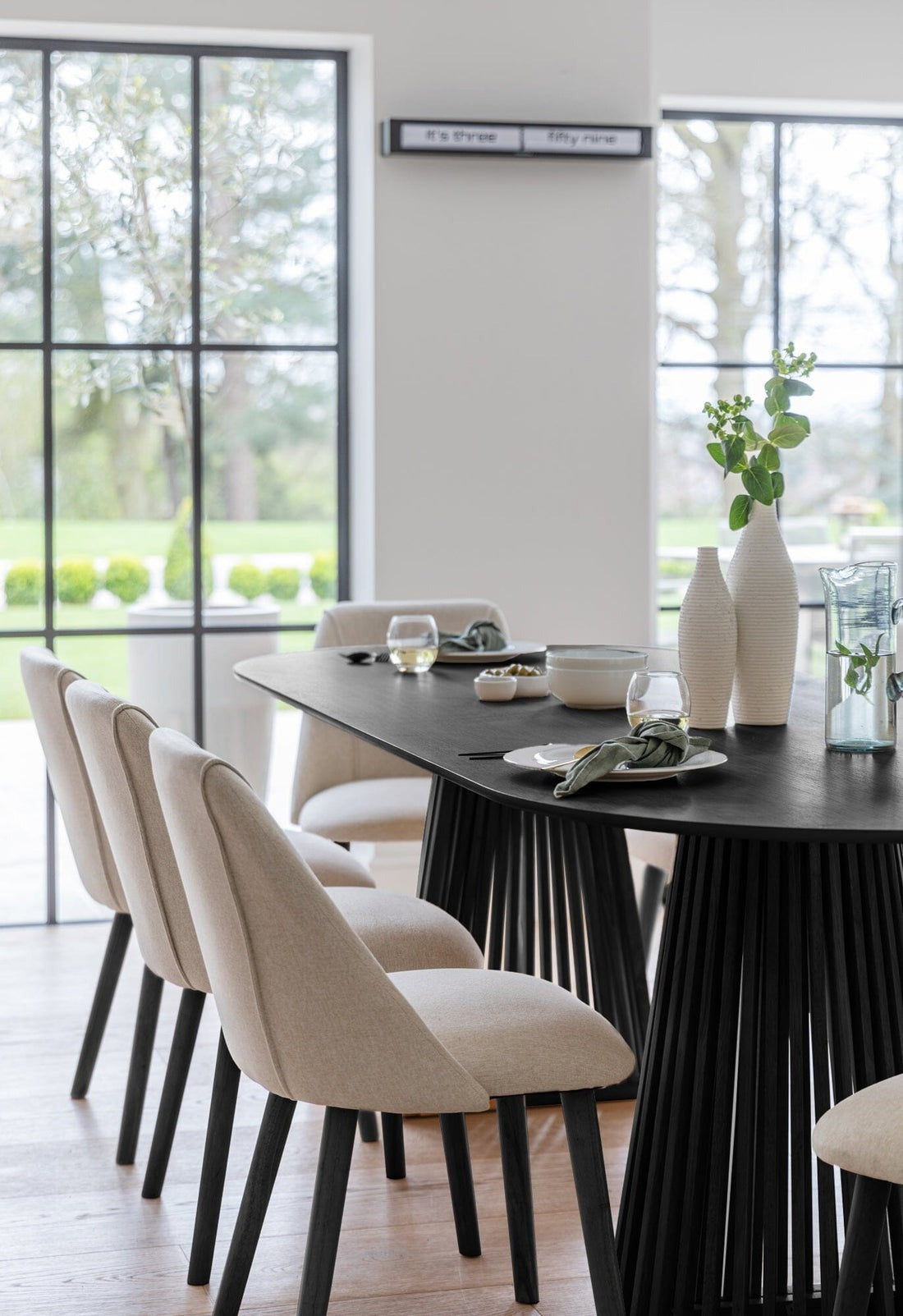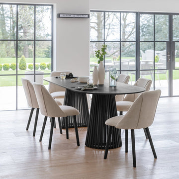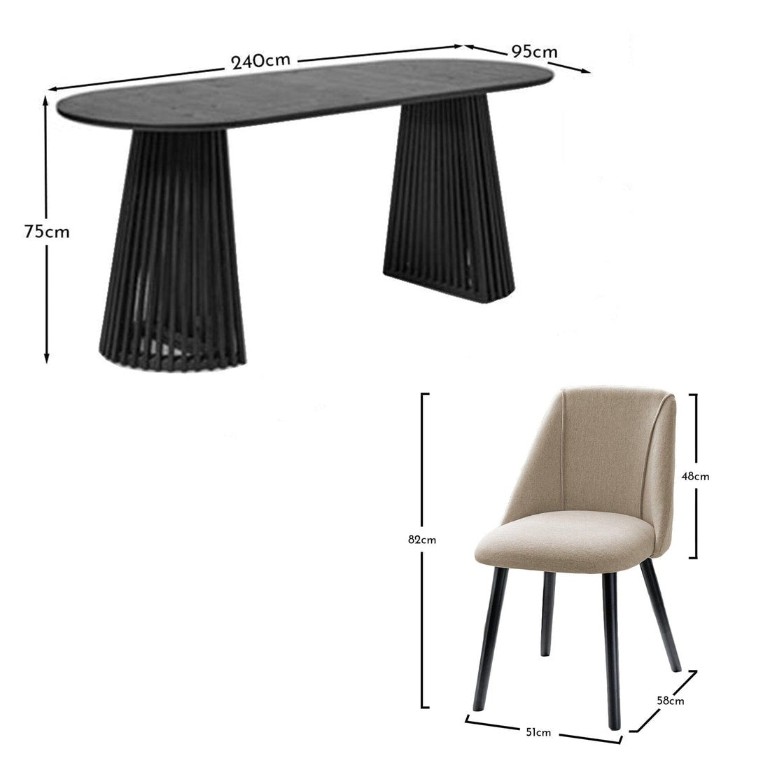 Refine your dining space with the Avira Dining Table and Elira Chairs Set. Made in India from solid mango wood, the table features a pale oak veneer finish, gracefully curved edges, and a striking slatted pedestal base. Designed to seat six, the set is paired with six Elira dining chairs upholstered in soft sand fabric, complemented by whitewashed mango wood legs for a modern yet timeless look.
