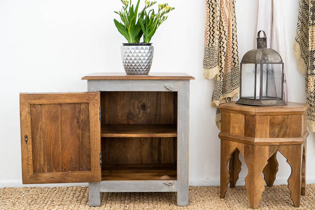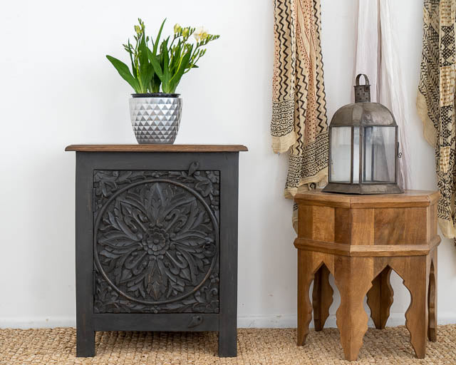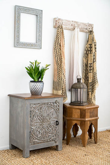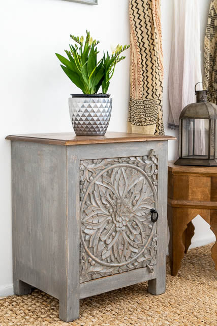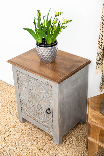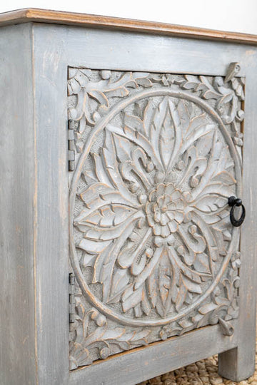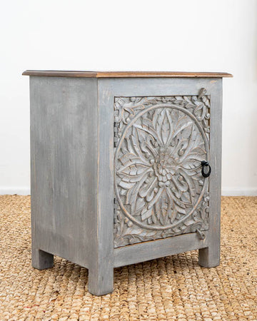 Introducing the Serene Grey Carved Bedside Table – a stylish and functional piece designed to enhance your bedroom decor. Crafted with intricate hand-carved detailing, this unique table stands out with its elegant grey finish, adding a touch of sophistication to any space. With dimensions of 60 cm x 40 cm, it offers ample surface area and storage while maintaining a compact footprint, making it perfect for keeping essentials within reach. The Serene Grey Carved Bedside Table combines artistry and practicality, bringing both charm and utility to your room.
