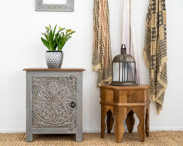 This table features exquisite hand-carved patterns that add texture and character to its elegant grey finish, creating a timeless look that complements various decor styles. Measuring 60 cm by 40 cm, it offers the perfect balance between compact design and functional storage, providing an ideal space for lamps, books, or personal essentials. The Serene Grey Bedside Table not only serves as a practical companion but also as a statement piece, bringing a blend of craftsmanship and modern style to your bedside.