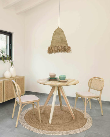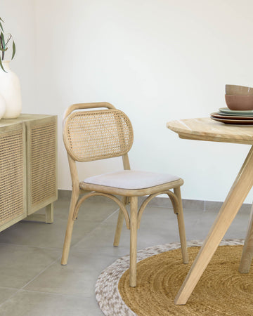 Introducing our sustainable Oak Chair, crafted from solid oak wood sourced from responsibly managed forests. The chair is finished with a natural oil to enhance its rich grain and provide a smooth, durable surface that will age beautifully over time. Its woven rattan backrest adds a touch of natural elegance, while the seat is upholstered in a linen-effect, water-repellent fabric, offering both comfort and practicality.