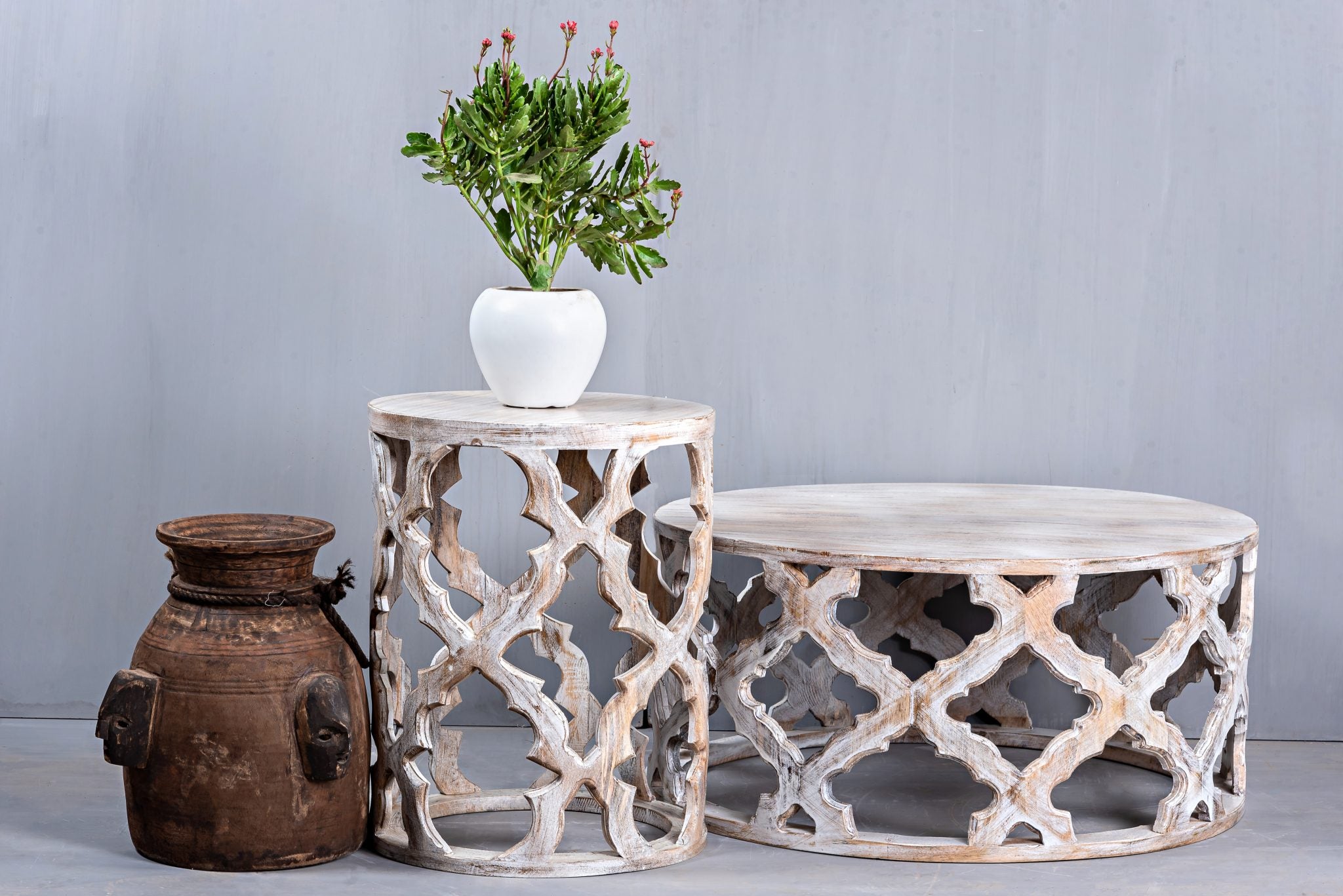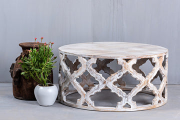 Crafted from high-quality wood, this coffee table showcases intricate hand-carved patterns, highlighted by a distressed whitewashed finish that adds a soft, aged look. The antique styling pairs perfectly with both modern and classic decor, making it versatile for any room. With its sturdy build and spacious surface, it's not only a stylish focal point but also a practical addition to your living space. Elevate your home’s ambiance with this timeless piece, designed to bring warmth, character, and charm to any setting.