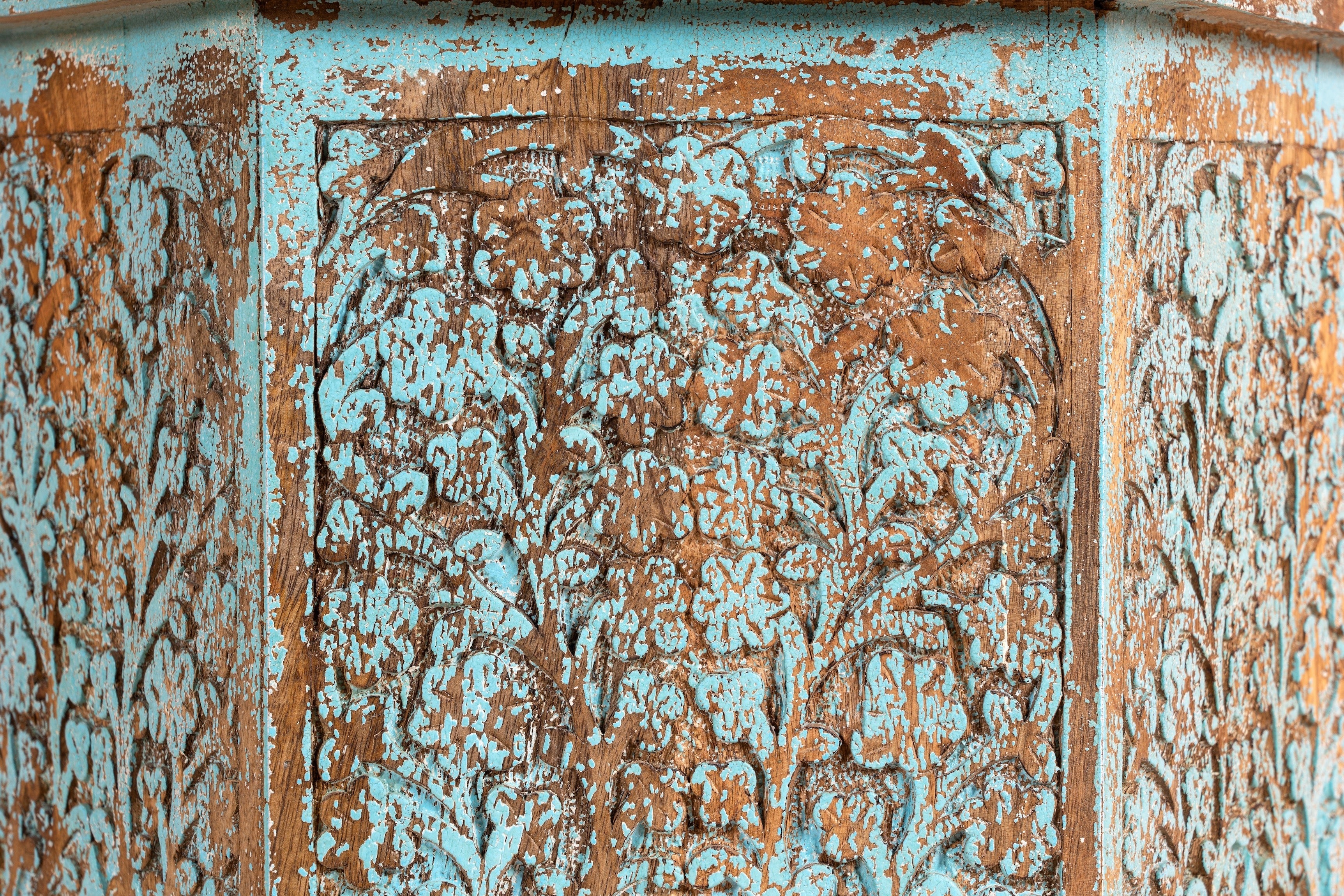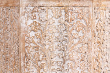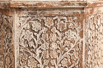 Introducing the Blossom Vine Coffee Table, a charming piece adorned with a beautifully intricate floral carving. Its striking, multi-layered finish adds a vintage touch to your home, blending character with elegance.