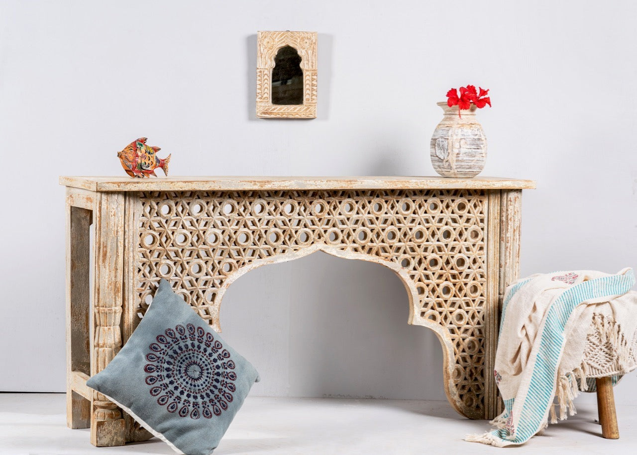 Each console is meticulously handcrafted, reflecting the skill and artistry of our artisans. The asymmetrical and irregular designs found in the hand-carved patterns lend distinctive character to every piece, ensuring that your console is truly one of a kind.