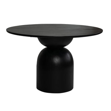 Make a bold statement with the Kalaara Dining Table, crafted from premium solid mango wood and finished in a deep matte black tone. Its sculptural pedestal base and smooth round top bring a perfect balance of modern design and Indian elegance, making it a striking centerpiece for contemporary dining spaces.