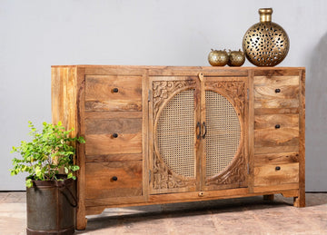 Introducing the Carve Sideboard , a stunning fusion of Indian craftsmanship and Scandinavian design. This unique piece of furniture, presented in its natural brown element, beautifully integrates rattan materials into a solid mango wood body, enhancing the overall aesthetic appeal.