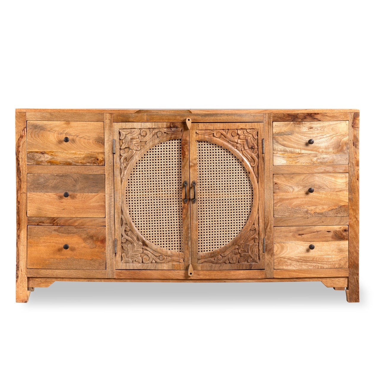 The Carve Sideboard  offers ample storage with six main drawers and two spacious compartments, elegantly concealed behind delicate rattan doors. This thoughtful design not only maximizes functionality but also adds a touch of sophistication to your living space.