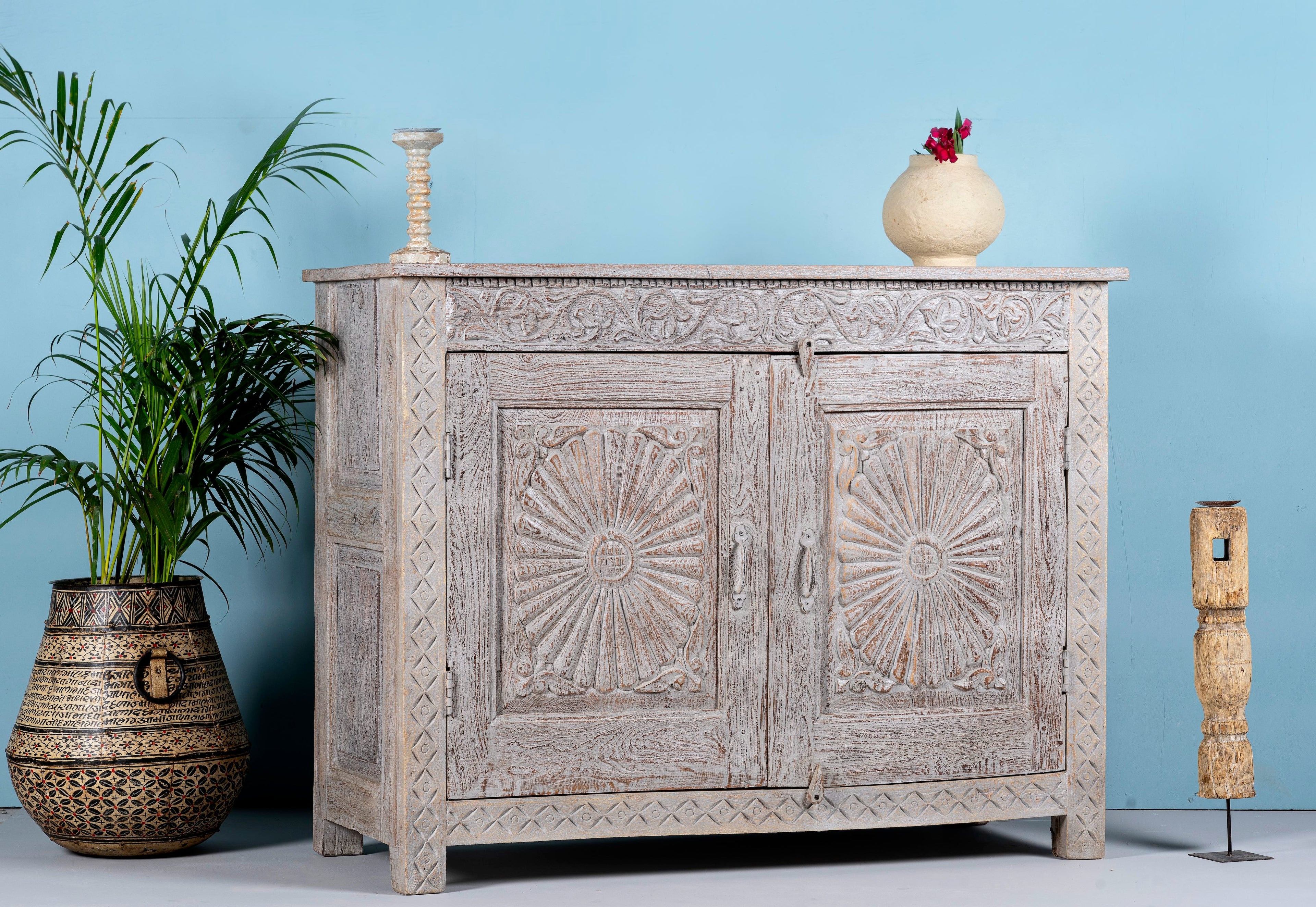 Introducing the Heritage Wide Sideboard, a captivating blend of Mediterranean style and Indian craftsmanship that will elevate any room in your home. Whether placed in your living room, bedroom, or bathroom, this sideboard is designed to make a statement. With its two spacious compartments, it offers ample storage while adding an exotic and sophisticated charm to your space. The front is adorned with intricate Indian wood carvings, adding a layer of cultural richness and artistry.