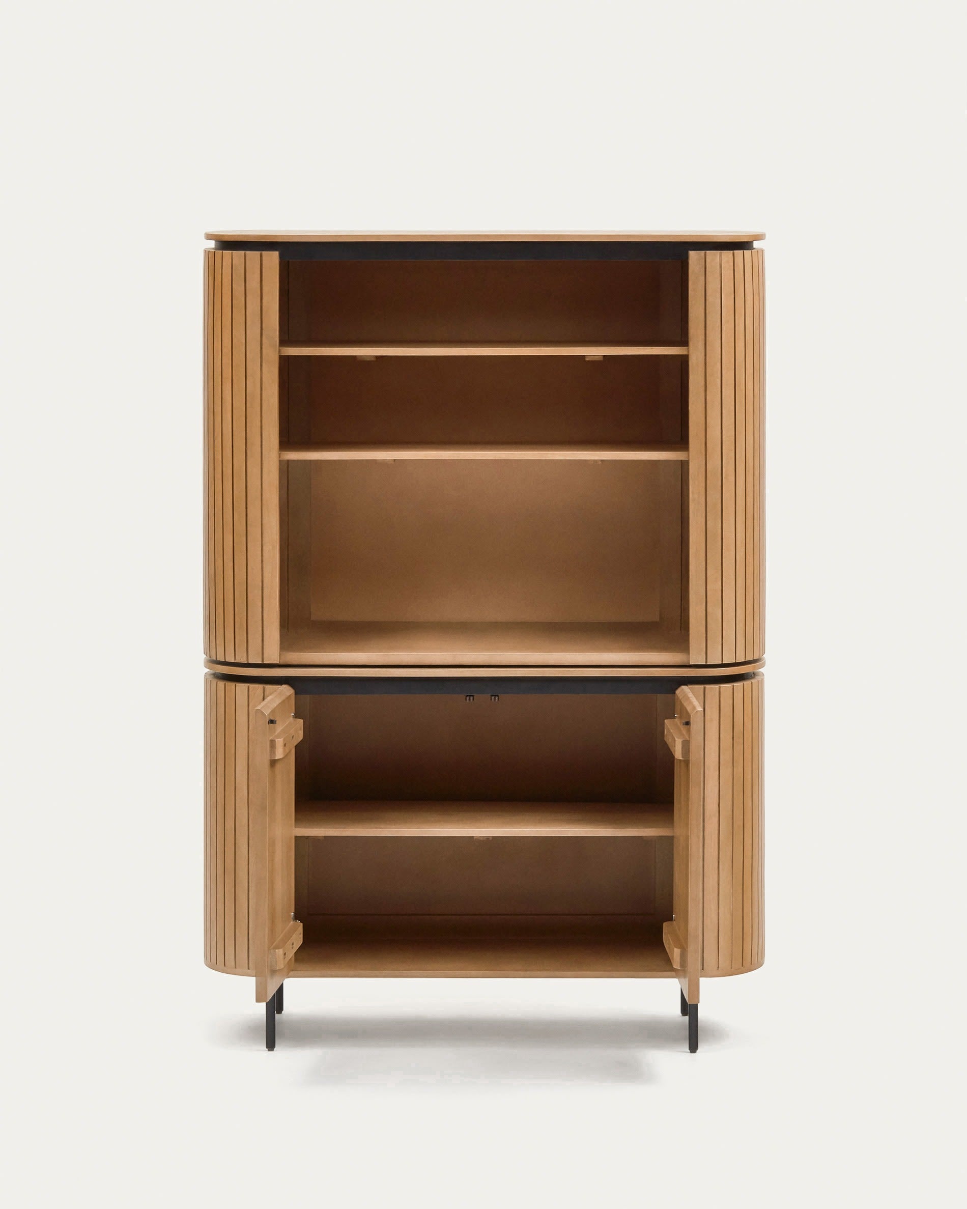 The design features meticulously arranged pieces of mango wood that curve and flow seamlessly, creating a bold yet elegant aesthetic. The spacious interior is perfect for organizing and storing essentials, making it as functional as it is stylish.