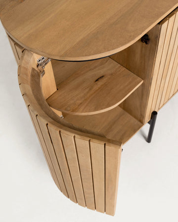 The design features individually arranged pieces of mango wood, expertly shaped to create a distinctive rounded silhouette that stands out as an artistic centerpiece. Behind the four spacious doors lies ample storage, perfect for organizing your dining essentials, books, or cherished belongings.