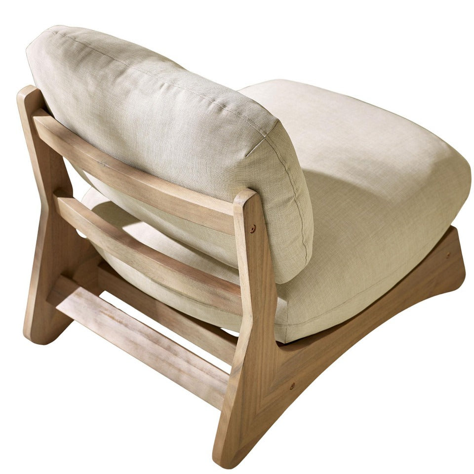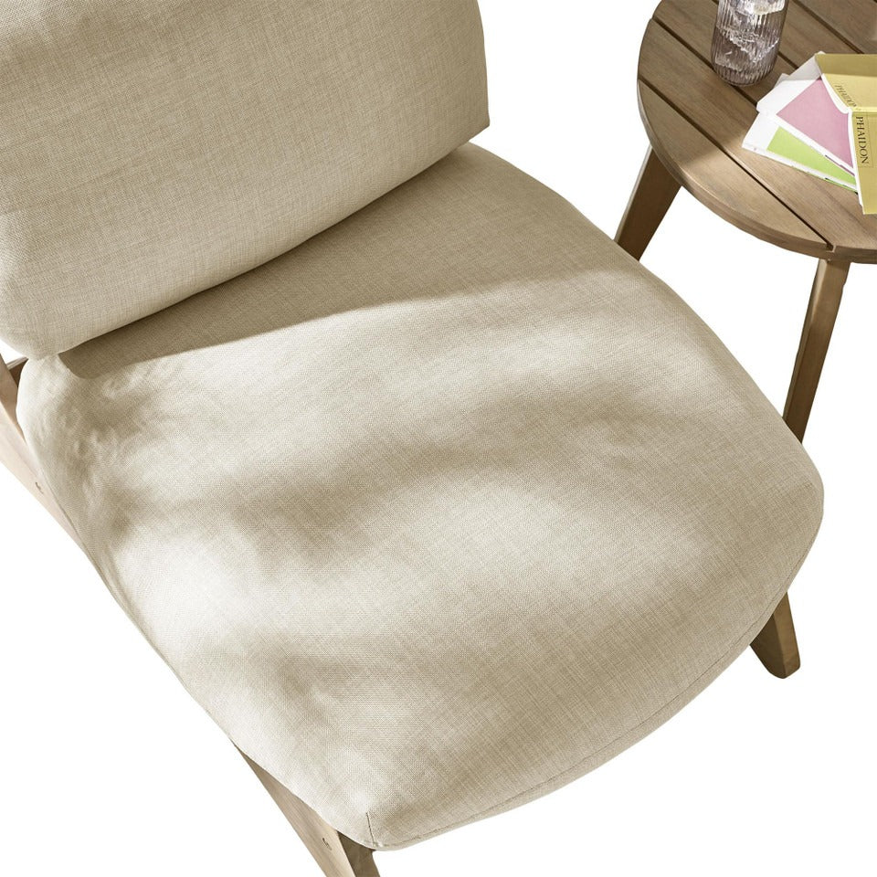 Expertly crafted in India from sustainably sourced acacia wood in a light teak stain, this piece reflects fine craftsmanship and enduring quality. The cushions are foam and fibre-filled, covered in weather-resistant Olefin fabric that’s safe for both outdoor lounging and indoor living.